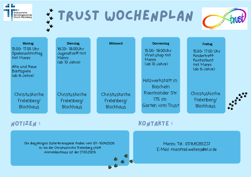 Aktueller Trust Wochenplan für den Bereich Frelenberg/ Holzwerkstatt in Boscheln.